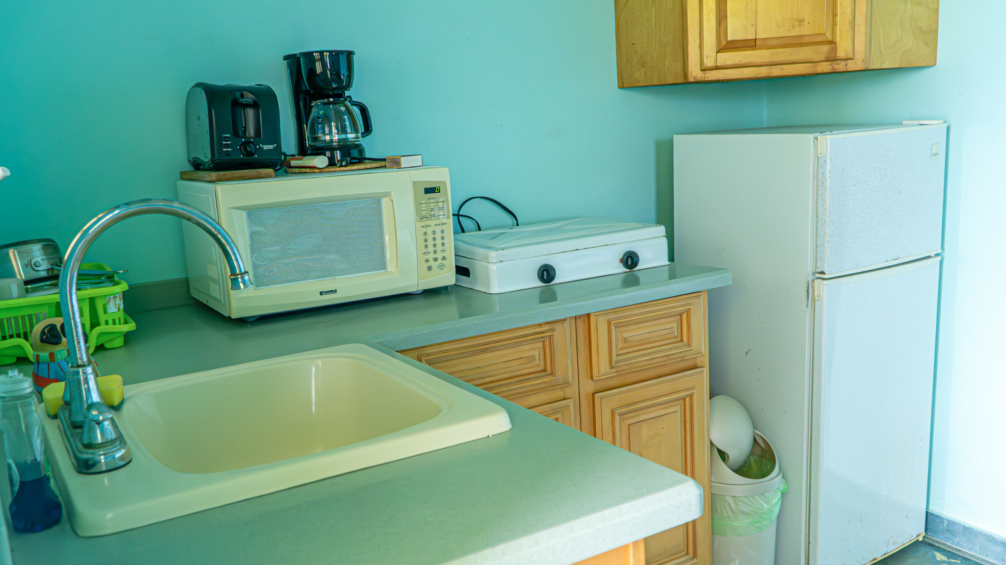 - Kitchenette with fridge, toaster, coffee maker, microwave, cookware, portable stove